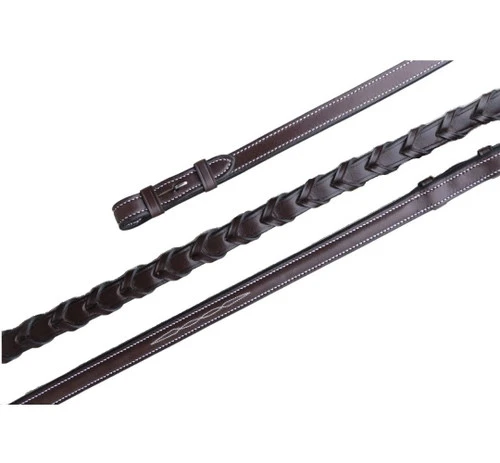 KL Select economy Black Oak Fancy Stitch Laced Reins features finished bevel edging, tapered ends, stainless steel buckle, and hook-stud ends. Brown. 5/8″ wide x 54″ long.