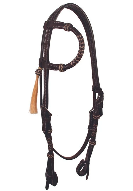 Buffalo Leather of the Rockies Rawhide Round Single Ear Headstall has a rich, handsome look in two-ply dark brown leather with rawhide accents. The one ear is woven brown and tan rawhide. It’s trimmed on the side with a long horse hair tassel with rawhide button.