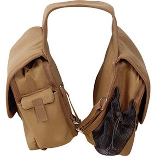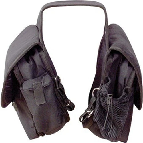 The Cashel Deluxe Saddle Bag is designed to carry all your necessities and attaches easily and securely to your Western saddle. Left main pocket has interior bottle pockets, and interior hook & loop closure, small padded pocket and two side mesh bottle holders. The right side has a main padded pocket with removable insulator and interior hook and loop closure, small padded pocket, cell phone pocket and side mesh bottle holder. Heavy weight nylon with heavy weight closures, tie on rings to hold bag stationary on the saddle.