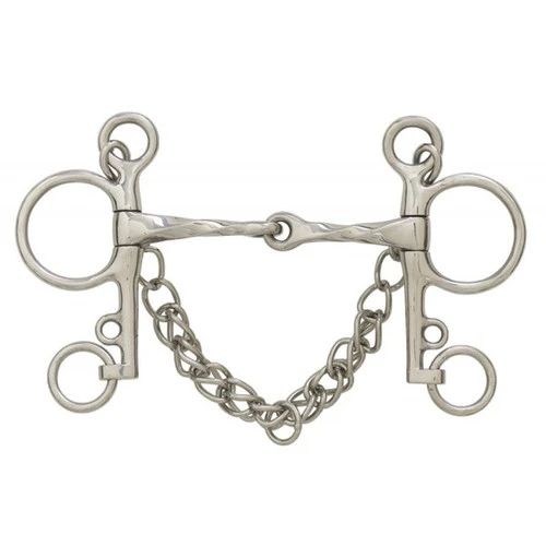Centaur Stainless Steel Slow Twist Mouth Single Jointed Pelham Bit with 5 inch cheeks. Stainless steel curb chain included. Lifetime guarantee against rust. Available in sizes 5, 5.5.