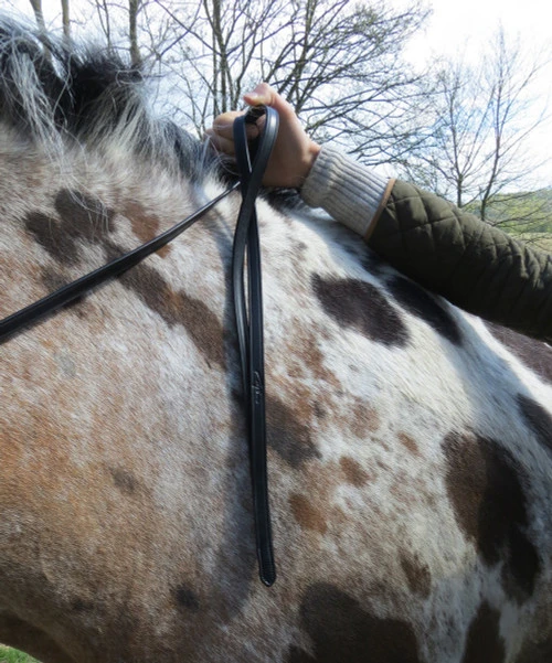 Dy’on Rolled Flat Reins at Mary’s are black dressage reins with elegant rolled round fronts. Dy’on tack from Belgium is carefully made from fine English leather that’s vegetable tanned and is supple and soft. These curb reins with no stops have stainless steel hardware. Please note, this pair of flat reins does not include any other tack items shown in the photo. Dressage reins with rolled fronts are the perfect match to Dy’on dressage bridles with rolled cheek pieces. The ends are sewn together in a unique way to allow them to hang nicely from the rider’s hand.