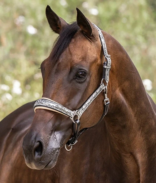 Limited edition Halter Ego Venetian Floral Halter is crafted with eco-friendly vegetable tanned leather that has a lovely finish and feel. The padded crown and noseband are lined with luxurious Nappa leather in cream color that beautifully frames the silver and black floral print. The crown is adjustable on both sides and the chin strap adjusts to achieve a custom fit for your horse. A side clip makes it easy to put on and remove or facilitate grooming. Don’t miss out on this lovely Venetian Floral Leather Halter, a Limited Edition from Halter Ego!
