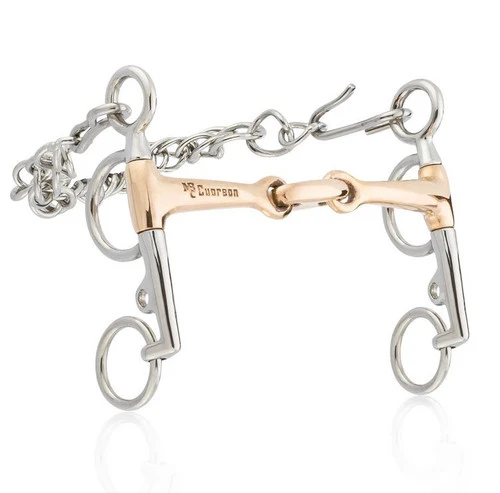 With its unique long grooved center link, Mikmar’s Cupreon Ergom Lozenge Pelham bit is designed to conform comfortably to the horse’s mouth, creating even pressure across the tongue. A copper alloy created exclusively for Mikmar, Cupreon is non-toxic and nickel-free, warms easily in the mouth, and encourages salivation and acceptance of the aids. 4 inch or 5 inch cheek. Sizes: 5, 5.25, 5.5.