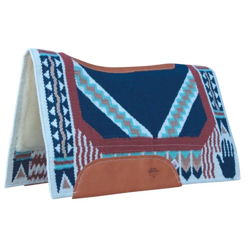 Comfort-Fit SMx Air Ride Saddle Pad locks into place on the horse’s back so the pad moves with the horse. The Air Ride core has a shock absorbing material found in protective athletic gear, giving your horse the ultimate in impact protection. It is lightweight and cooling to reduce muscle fatigue and improves saddle fit. The merino wool fleece bottom is sweat wicking and breathable. The custom designed New Zealand wool hand-woven blanket top is truly special. The Hand to Horse pad from Professional’s Choice was designed to honor the trust and communication between horse and rider. The hand print, lightning, and feather images are meaningful symbols for horses from Native American lore.