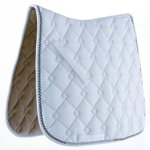 Roma Ecole Double Diamond Dressage Pads are deluxe quilted saddle pads in an array of gorgeous colors. These beautiful saddle pads have a large and small interlocking diamond pattern that’s elegant and unusual. The Ecole dressage saddle pad has a contoured topline for proper fit under your dressage saddle. It’s available in black, white, and an array of lovely colors with coordinating trim. Roma Ecole Double Diamond square pads have nice cushioning, but not too much, and are moisture wicking and quick drying.