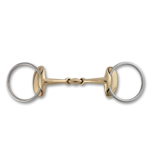 The Stubben Golden Wings Double Jointed Loose Ring Snaffle Bit is gentle, sensitive, and 100% pinchless, with no nutcracker effect. Revolutionary safeguard plates offer maximum protection to the delicate corners of the horse’s mouth, prevent the bit rings from being pulled through the mouth, and provide a gentle correction to resistance to the direct rein. Sweet copper encourages salivation. Easily accepted, especially by inexperienced horses. Sizes: 5, 5 1/4, 5 3/4.